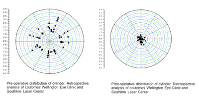 - 141명의 고도 난시를 가진 환자의 경우, 수술 전 여러 축으로 분포되어 있던 난시(~4.5D)가 Allegretto Wave Eye-Q로 교정 후 정시(≒0D)로 교정되는 뛰어난 효과를 확인하실 수 있습니다.